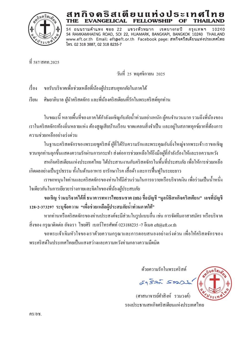 สหกิจคริสเตียนแห่งประเทศไทยออกจดหมายเชิญชวนคริสตจักรร่วมบริจาค ช่วยผู้ประสบภัยน้ำท่วมภาคใต้