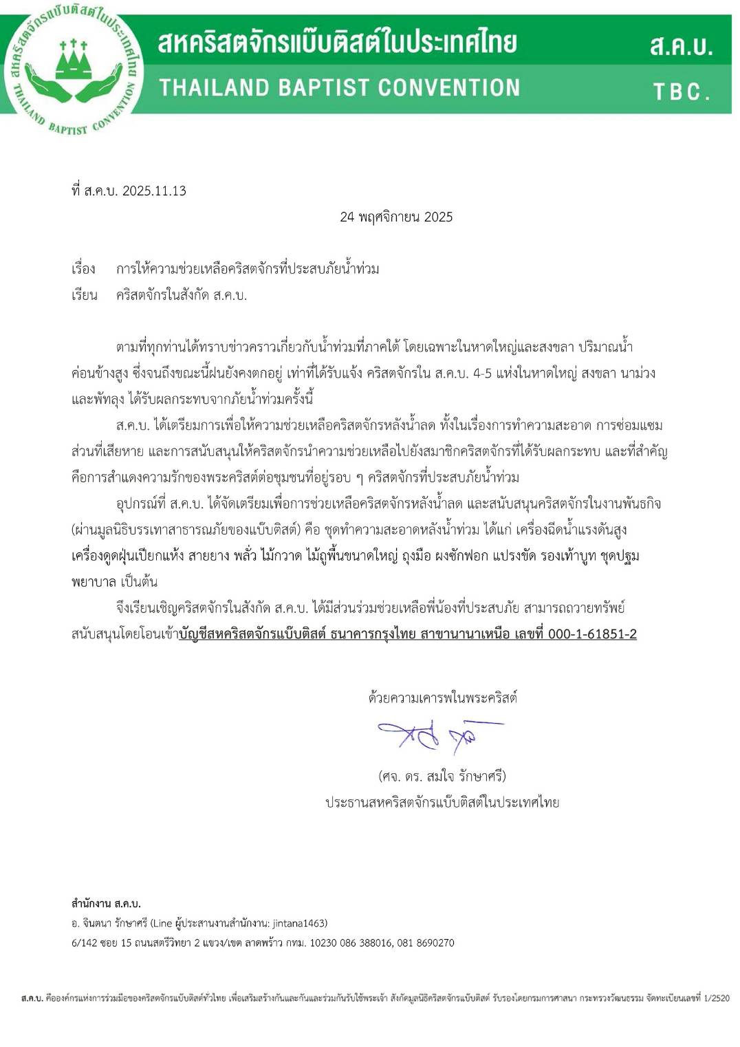 สหคริสตจักรแบ๊บติสต์ในประเทศไทย (ส.ค.บ.) ออกแถลงการณ์ด่วนเพื่อรายงานความคืบหน้าการขยายเครือข่ายช่วยเหลือคริสตจักรในสังกัดที่ได้รับผลกระทบจากสถานการณ์น้ำท่วมในภาคใต้ โดยมุ่งเน้นพื้นที่ที่ได้รับผลกระทบหนัก ได้แก่ หาดใหญ่ สงขลา นาม่วง และพัทลุง พร้อมเชิญชวนพี่น้องอธิษฐานเผื่อและร่วมหนุนน้ำใจผู้ประสบภัย