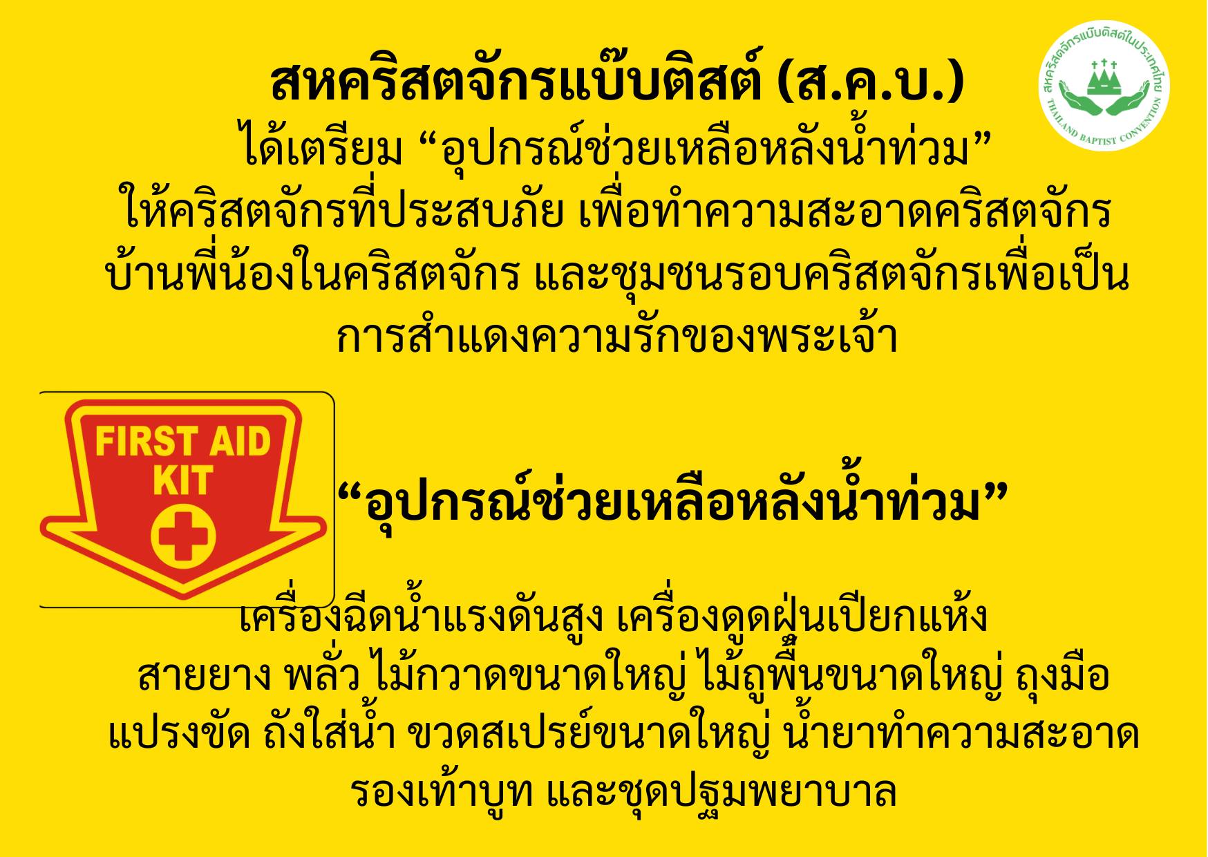 เพื่อให้การฟื้นฟูเกิดขึ้นอย่างเป็นรูปธรรม ส.ค.บ. ได้จัดเตรียม "อุปกรณ์ช่วยเหลือหลังน้ำท่วม" (Post-Flood Relief Equipment) สำหรับการทำความสะอาดคริสตจักร บ้านสมาชิก และพื้นที่ชุมชน โดยประกอบด้วยเครื่องฉีดน้ำแรงดันสูง เครื่องดูดฝุ่นแบบเปียกและแห้ง รองเท้าบูท และชุดปฐมพยาบาล รวมถึงอุปกรณ์ทำความสะอาดอื่นที่จำเป็น เช่น สายยาง พลั่ว ไม้กวาดขนาดใหญ่ ไม้ถูพื้น ถุงมือ แปรงขัด ถังน้ำ ขวดสเปรย์ และน้ำยาทำความสะอาด