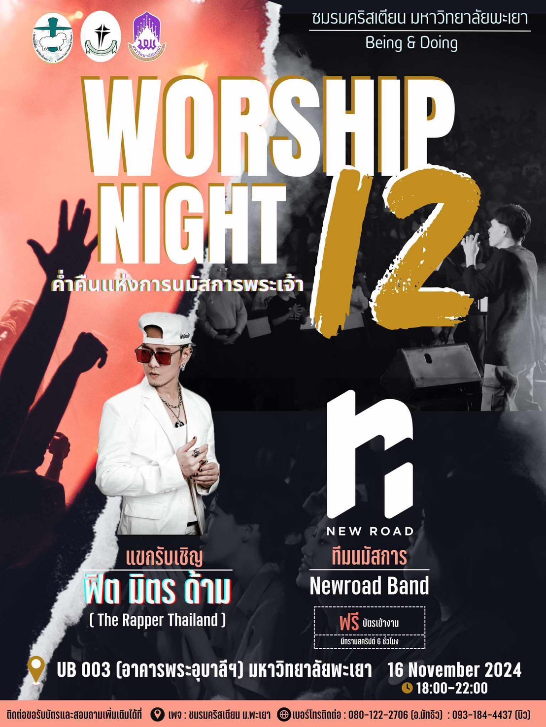มหาวิทยาลัยพะเยาขอเชิญชวนทุกท่านเข้าร่วมค่ำคืนแห่งการนมัสการพระเจ้าในงาน Worship Night ครั้งที่ 12 ซึ่งจะจัดขึ้นในวันเสาร์ที่ 16 พฤศจิกายน 2024 ตั้งแต่เวลา 18:00 - 22:00 น. ณ อาคารอุบาลี ห้อง UB003 มหาวิทยาลัยพะเยา โดยงานนี้จะมีการแสดงจากศิลปินรับเชิญ ฟิต มิตร ด้าม จากรายการ The Rapper Thailand และทีมนมัสการ Newroad Band ที่จะมาร่วมสร้างบรรยากาศแห่งการนมัสการอันเต็มไปด้วยพลังแห่งความเชื่อ