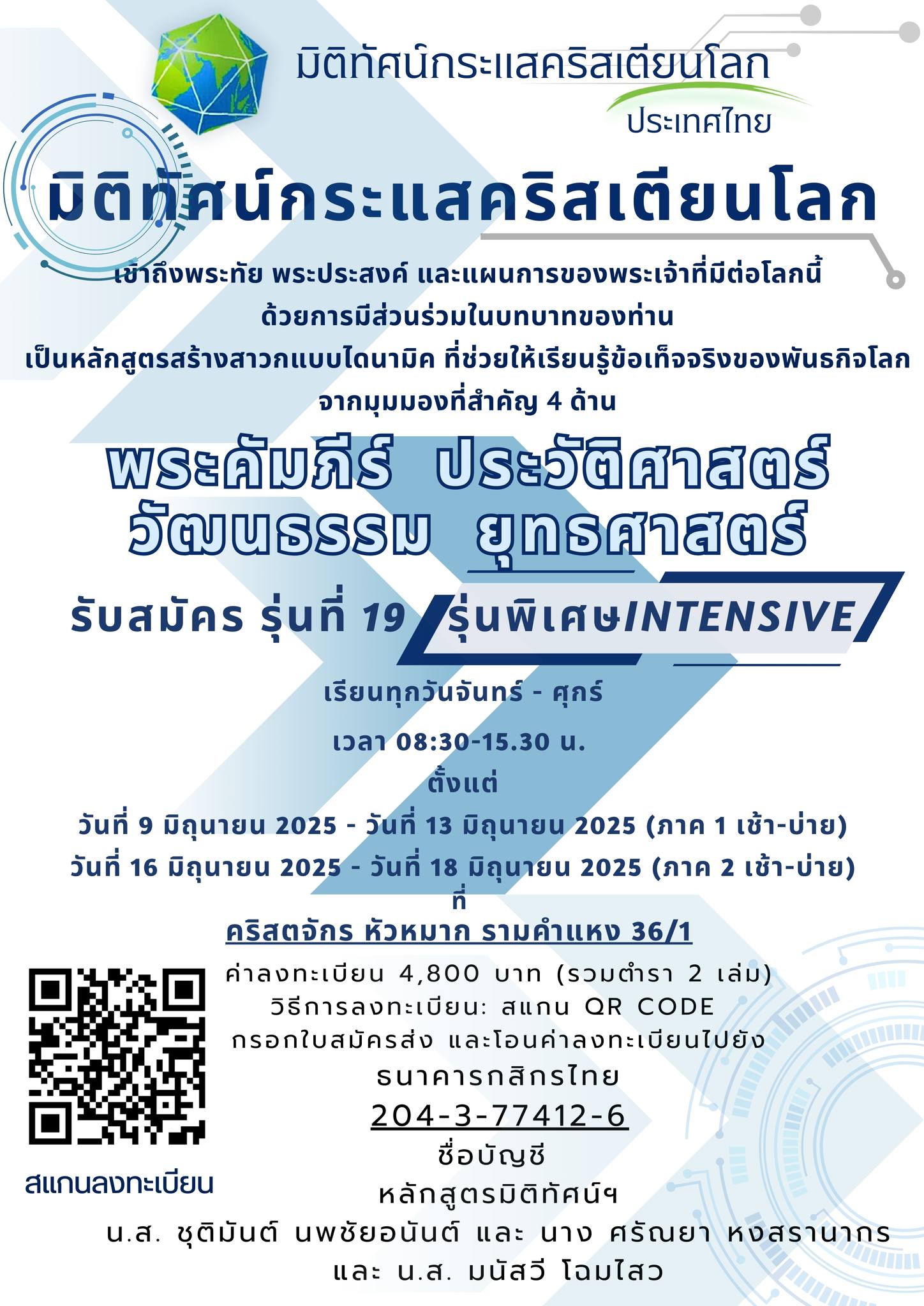 โอกาสพิเศษสำหรับผู้สนใจพันธกิจและการประกาศข่าวประเสริฐทั่วโลก หลักสูตร มิติทัศน์กระแสคริสเตียนโลก รุ่นที่ 19 (Intensive) เปิดรับสมัครแล้ววันนี้! หลักสูตรเข้มข้นภายใน 2 สัปดาห์ ที่จะพาผู้เรียนก้าวลึกสู่รากฐานพระคัมภีร์ ประวัติศาสตร์โลกแห่งความเชื่อ เข้าใจวัฒนธรรมและยุทธศาสตร์การส่งเสริมพันธกิจ พร้อมเสริมสร้างมุมมองที่สอดคล้องกับสายพระเนตรของพระเจ้า เพื่อการรับใช้ที่นำผลจากท้องถิ่นสู่สากล