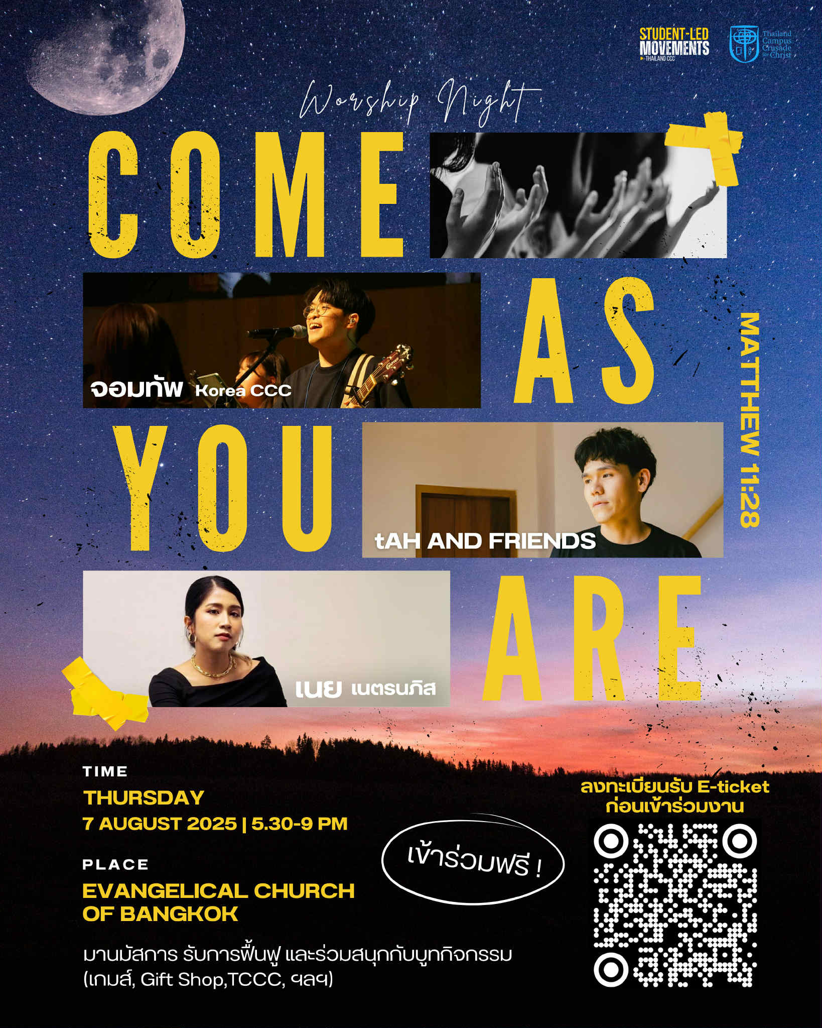 องค์การไทยแลนด์แคมพัสครูเสดฟอร์ไครสท์ (TCCC) แผนกมหาวิทยาลัย ขอเชิญคริสเตียนและผู้สนใจทุกท่านเข้าร่วมงาน Worship Night ภายใต้ธีม "Come As You Are" เพื่อมาร่วมกันนมัสการพระเจ้าในแบบที่แต่ละคนเป็น โดยไม่ต้องเสแสร้งหรือปรุงแต่ง เพราะพระเจ้าทรงยินดีต้อนรับเราทุกคนให้เข้ามาใกล้พระองค์อย่างแท้จริง