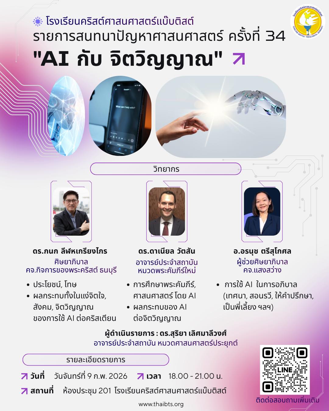 โรงเรียนคริสต์ศาสนศาสตร์แบ๊บติสต์ ขอเชิญนักศึกษา ศิษย์เก่า และคริสเตียนผู้สนใจ เข้าร่วมรับฟังการอภิปรายในรายการสนทนาปัญหาศาสนศาสตร์ครั้งที่ 34 ภายใต้หัวข้อ "AI กับจิตวิญญาณ" เพื่อร่วมพิจารณาและแลกเปลี่ยนมุมมองต่อบทบาทของเทคโนโลยีปัญญาประดิษฐ์ที่ส่งผลต่อความเชื่อ ชีวิตคริสเตียน และการรับใช้ในบริบทปัจจุบัน