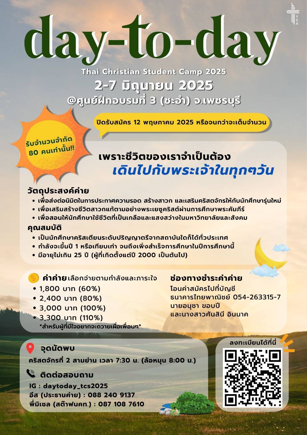 ค่ายนักศึกษาคริสเตียนประจำปี 2025 “day-to-day” เปิดรับสมัครแล้ว! เชิญนักศึกษาคริสเตียนระดับปริญญาตรีทั่วประเทศ อายุไม่เกิน 25 ปี เข้าร่วมค่ายวันที่ 2-7 มิถุนายน ณ ศูนย์ฝึกอบรมที่ 3 (ชะอำ) จังหวัดเพชรบุรี รับจำนวนจำกัดเพียง 80 คนเท่านั้น
