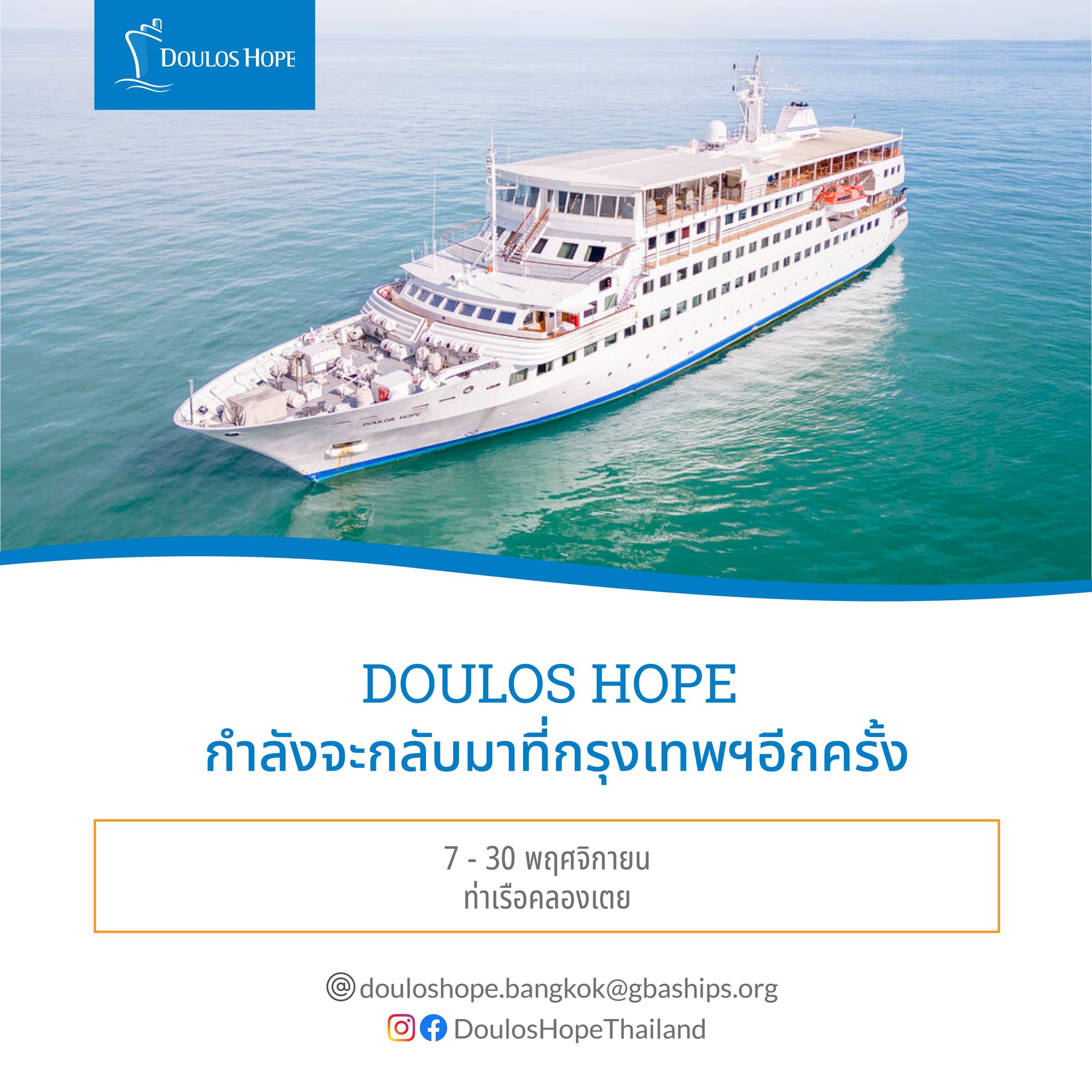 เรือดูโลสโฮปถือเป็นเรือหนังสือลอยน้ำที่ใหญ่เป็นอันดับ 2 ของโลก และกลับมาเยือนกรุงเทพฯ อีกครั้งในรอบ 2 ปี รอติดตามรายละเอียดการเข้าชมเร็วๆ นี้ สอบถามข้อมูลเพิ่มเติมได้ที่ Facebook: DoulosHopeThailand