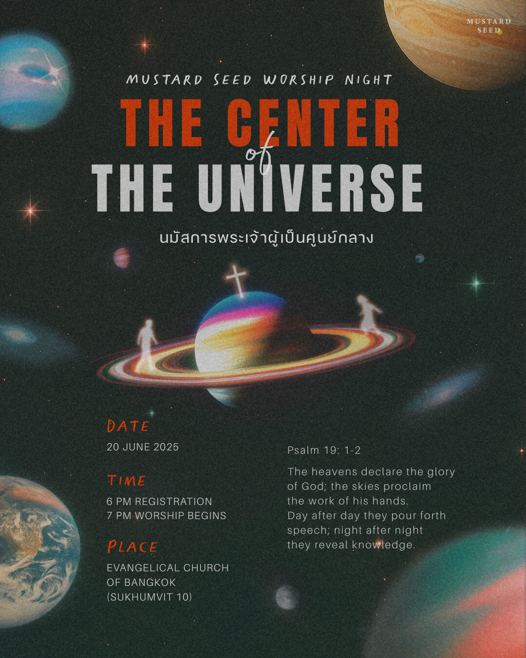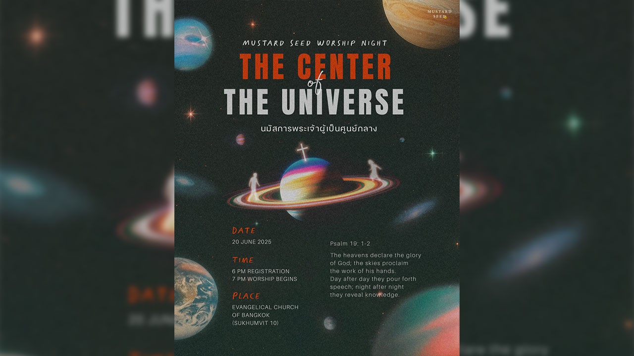 Mustard Seed ชวนเพื่อนๆ มาปล่อยใจในค่ำคืนพิเศษ “Worship Night: THE CENTER of THE UNIVERSE” วันที่ 20 มิถุนายนนี้ ที่คริสตจักร Evangelical Church of Bangkok (สุขุมวิท 10) มาด้วยกันเพื่อพักใจ ซึมซับความอัศจรรย์ของจักรวาลที่พระเจ้าทรงสร้าง แล้วหันมาให้พระองค์เป็นศูนย์กลางของชีวิตเราอีกครั้ง ไม่ต้องแต่งตัวจัด ไม่ต้องเกร็ง แค่มาด้วยหัวใจพร้อมนมัสการ ก็พอแล้วค่ะ