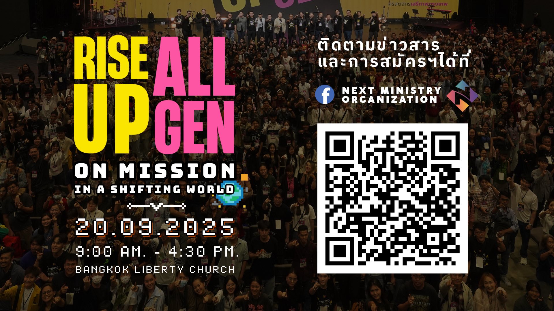 ในยุคที่เทคโนโลยี ค่านิยม เพศ สิ่งแวดล้อม สุขภาพจิต และโครงสร้างสังคมเปลี่ยนแปลงอย่างไม่หยุดยั้ง Rise Up All Gen ขอเป็นเวทีที่ช่วยให้คริสเตียนทุกวัยเข้าใจ ปรับตัว และลุกขึ้นเป็นเกลือและแสงสว่างในโลกที่ไม่เหมือนเดิม
