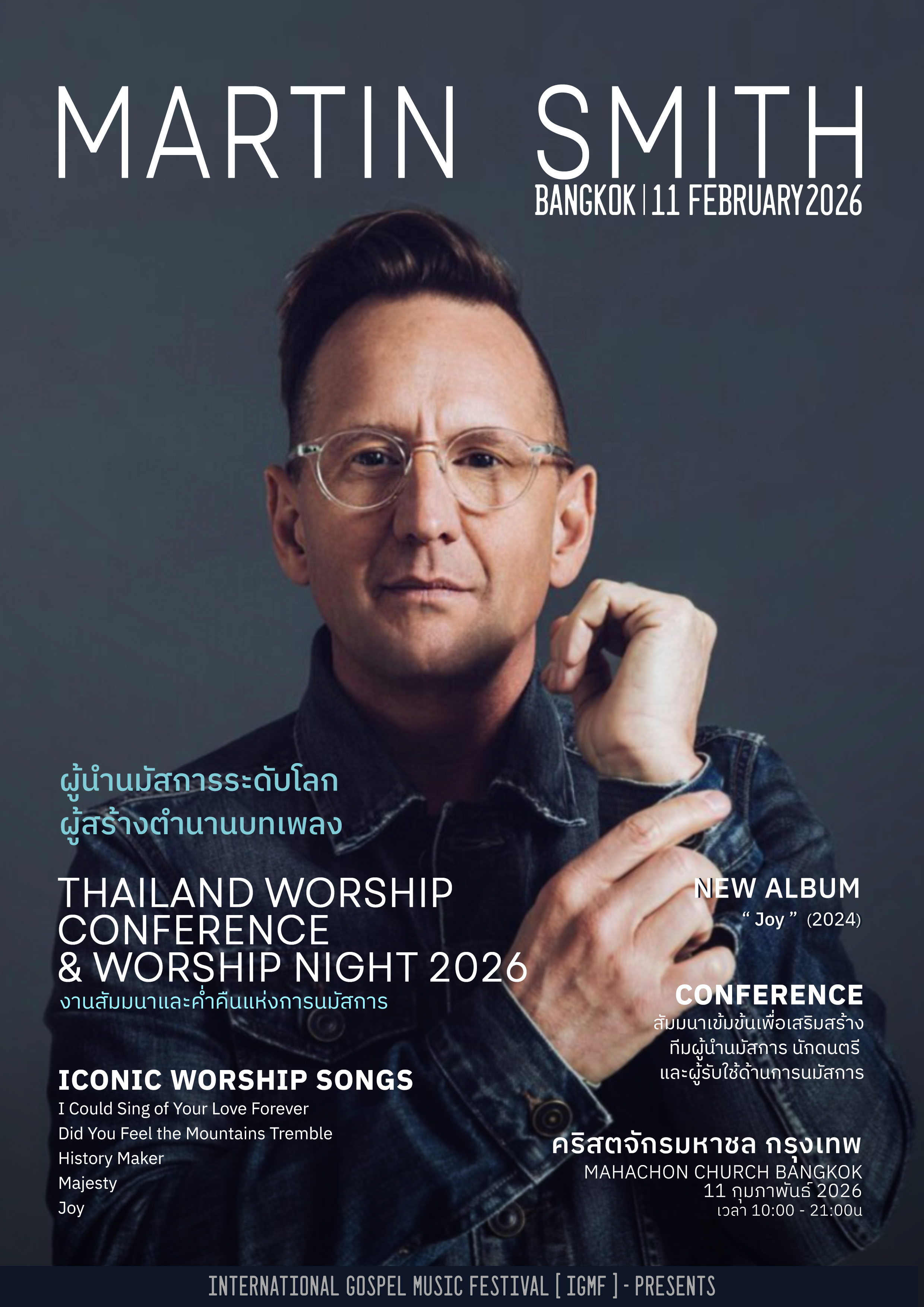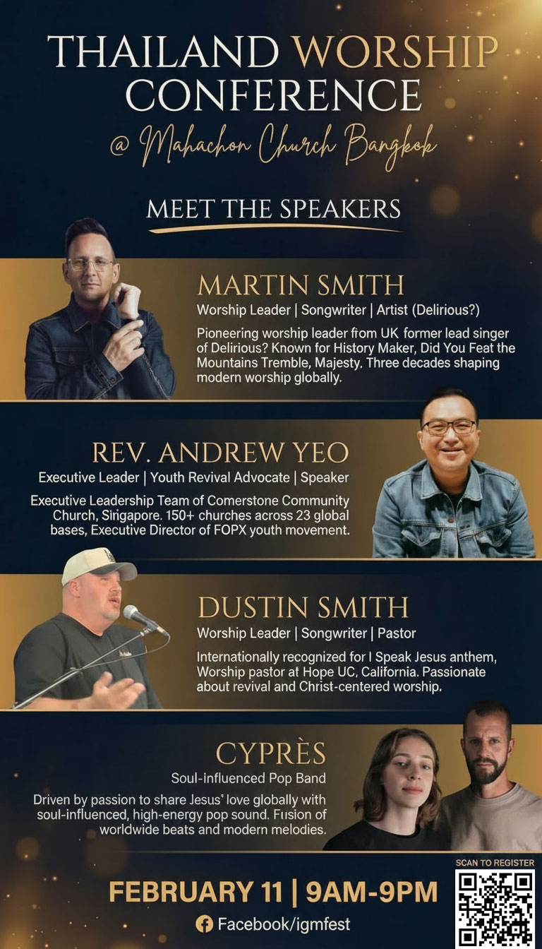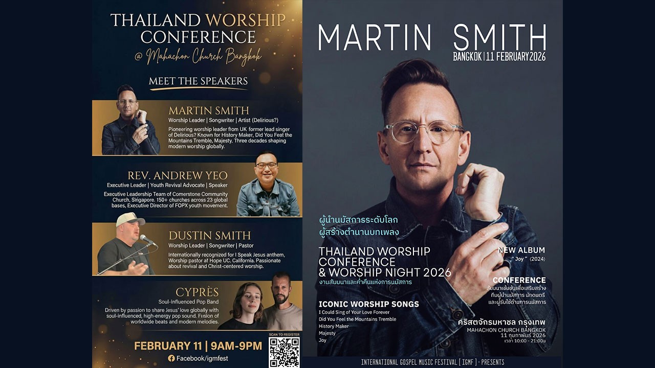 ประเทศไทยเตรียมต้อนรับงานนมัสการระดับนานาชาติ Thailand Worship Conference & Worship Night 2026 งานสัมมนาและค่ำคืนแห่งการนมัสการ ที่รวบรวมผู้นำนมัสการ นักแต่งเพลง และผู้รับใช้จากหลายประเทศ มาร่วมถ่ายทอดประสบการณ์ ความรู้ และการรับใช้ที่ยืนอยู่บนพระคำอย่างมั่นคง จัดขึ้นในวันที่ 11 กุมภาพันธ์ 2026 ณ คริสตจักรมหาชล กรุงเทพฯ ตั้งแต่เวลา 10.00–21.00 น.