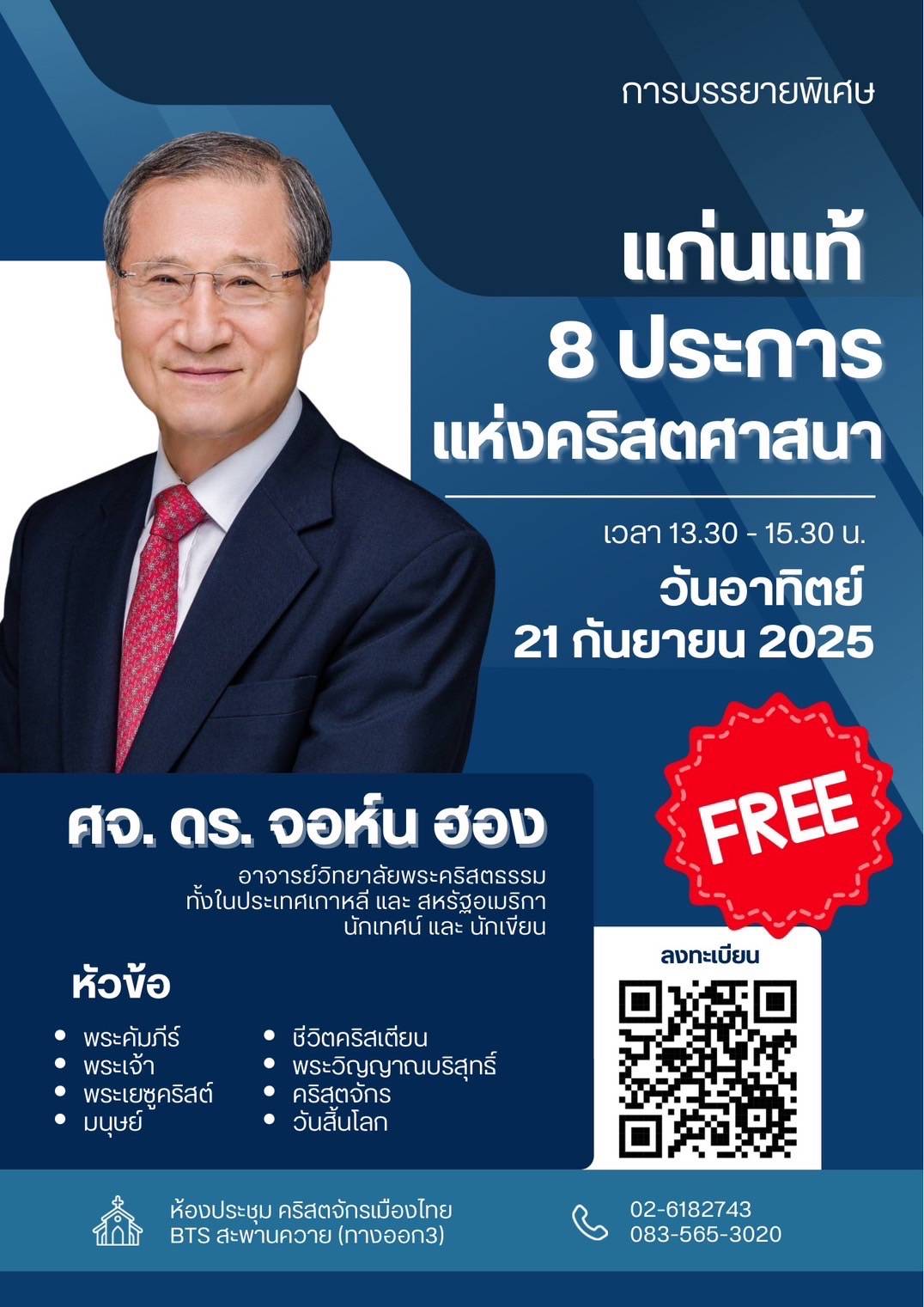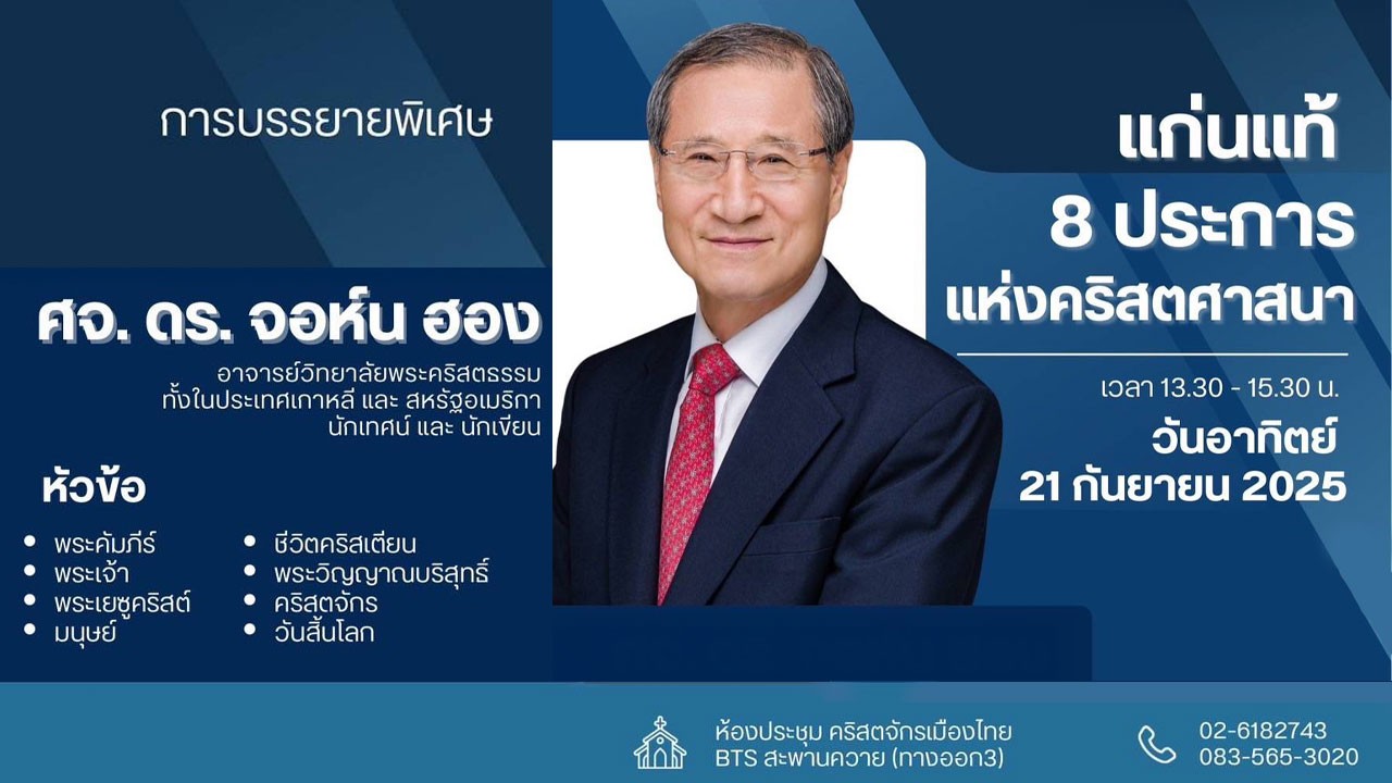 ขอเชิญร่วมฟังการบรรยายพิเศษในหัวข้อ "แก่นแท้ 8 ประการแห่งคริสตศาสนา" โดย ศจ.ดร.จอห์น ฮอง อาจารย์ประจำวิทยาลัยพระคริสตธรรมในประเทศเกาหลีและสหรัฐฯ นักเทศน์และนักเขียนผู้ได้รับการยอมรับอย่างกว้างขวาง