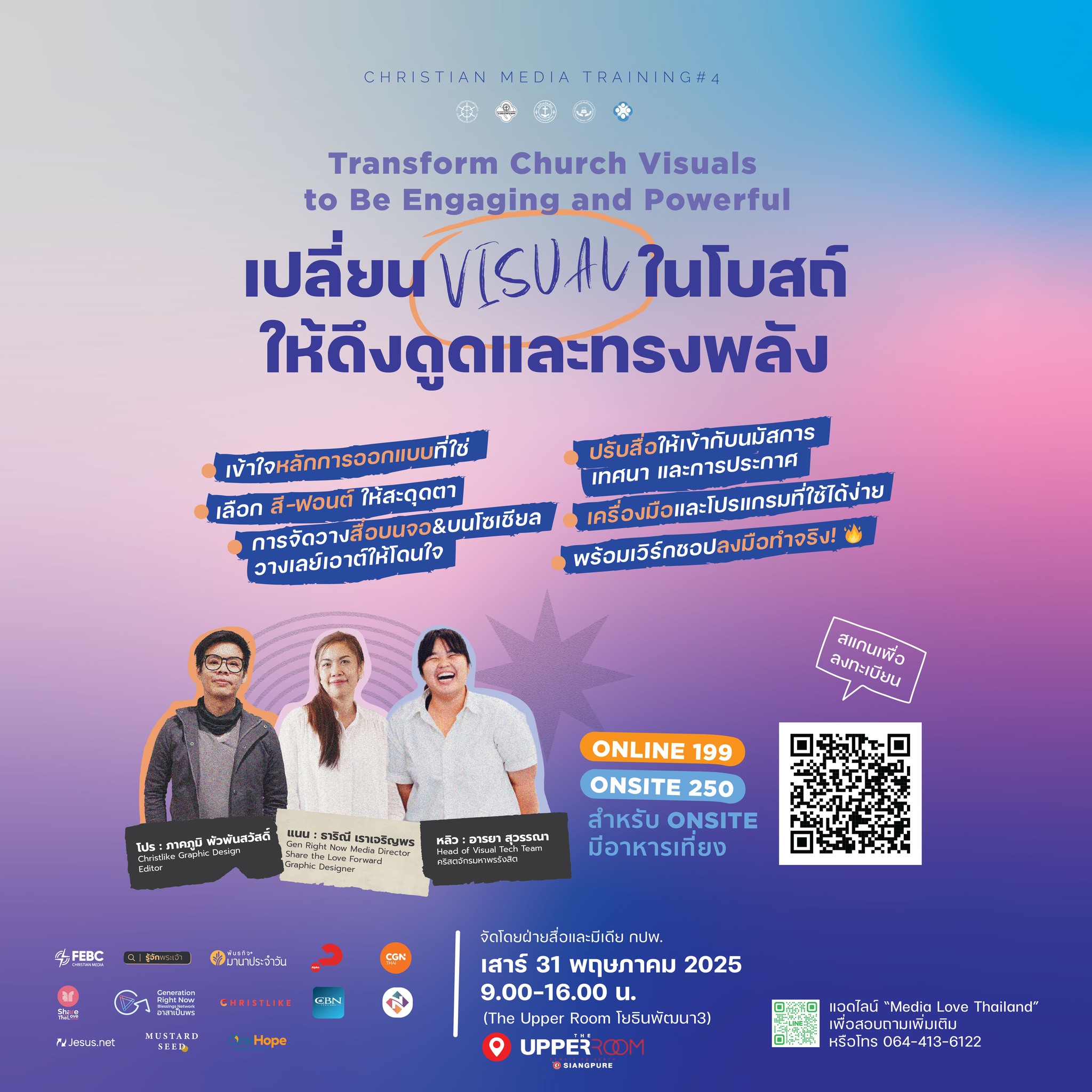 ขอเชิญผู้รับใช้ ผู้นำฝ่ายนมัสการ ทีมสื่อ และคริสเตียนที่สนใจงานออกแบบ เข้าร่วมอบรม “คริสเตียนมีเดียครั้งที่ 4: เปลี่ยน Visual ในโบสถ์ ให้ดึงดูดและทรงพลัง” อบรมสุดครีเอทีฟที่จะช่วยเปิดมุมมองใหม่ในการออกแบบสื่อโบสถ์อย่างสร้างสรรค์ เข้าใจหลักการออกแบบที่เหมาะสม เลือกใช้สีและฟอนต์ให้สะดุดตา วางเลย์เอาต์ให้สื่อสารใจความได้อย่างตรงจุด พร้อมเรียนรู้การปรับใช้กับบริบทของงานนมัสการ เทศนา และการประกาศข่าวประเสริฐ ผ่านเวิร์กชอปที่ให้ลงมือทำจริง