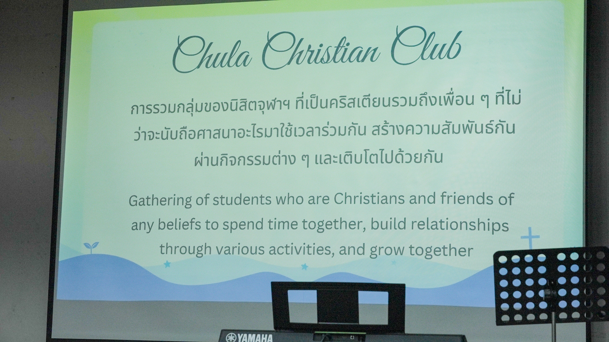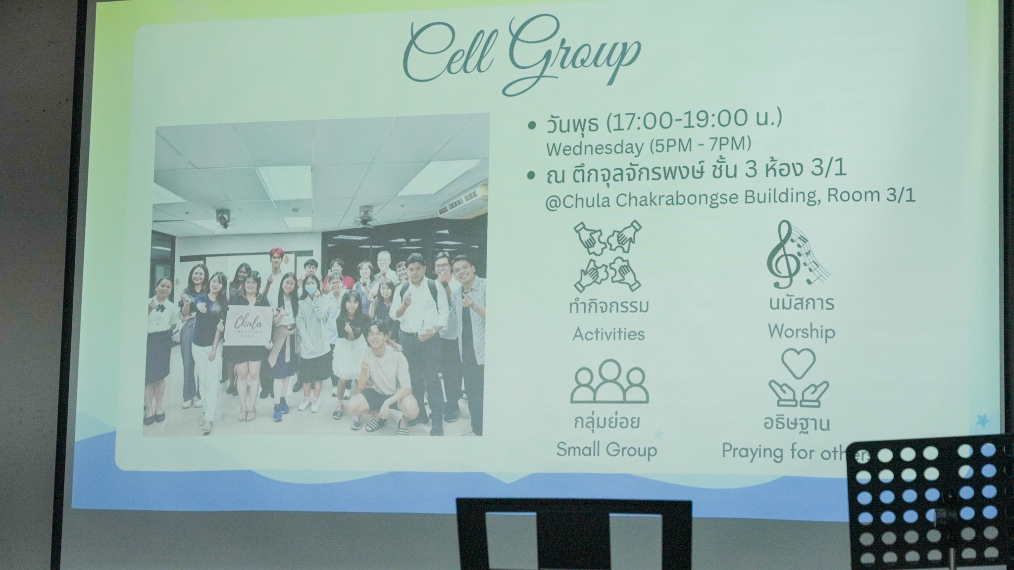 ทั้งนี้ ชมรมคริสเตียนจุฬาฯ หรือ Chula Christian Club เป็นการรวมกลุ่มของนิสิตจุฬาฯ ที่เป็นคริสเตียนรวมถึงเพื่อนที่ไม่ว่าจะนับถือศาสนาอะไร มาใช้เวลาร่วมกัน สร้างความสัมพันธ์กันผ่านกิจกรรมต่างๆ และเติบโตไปด้วยกัน