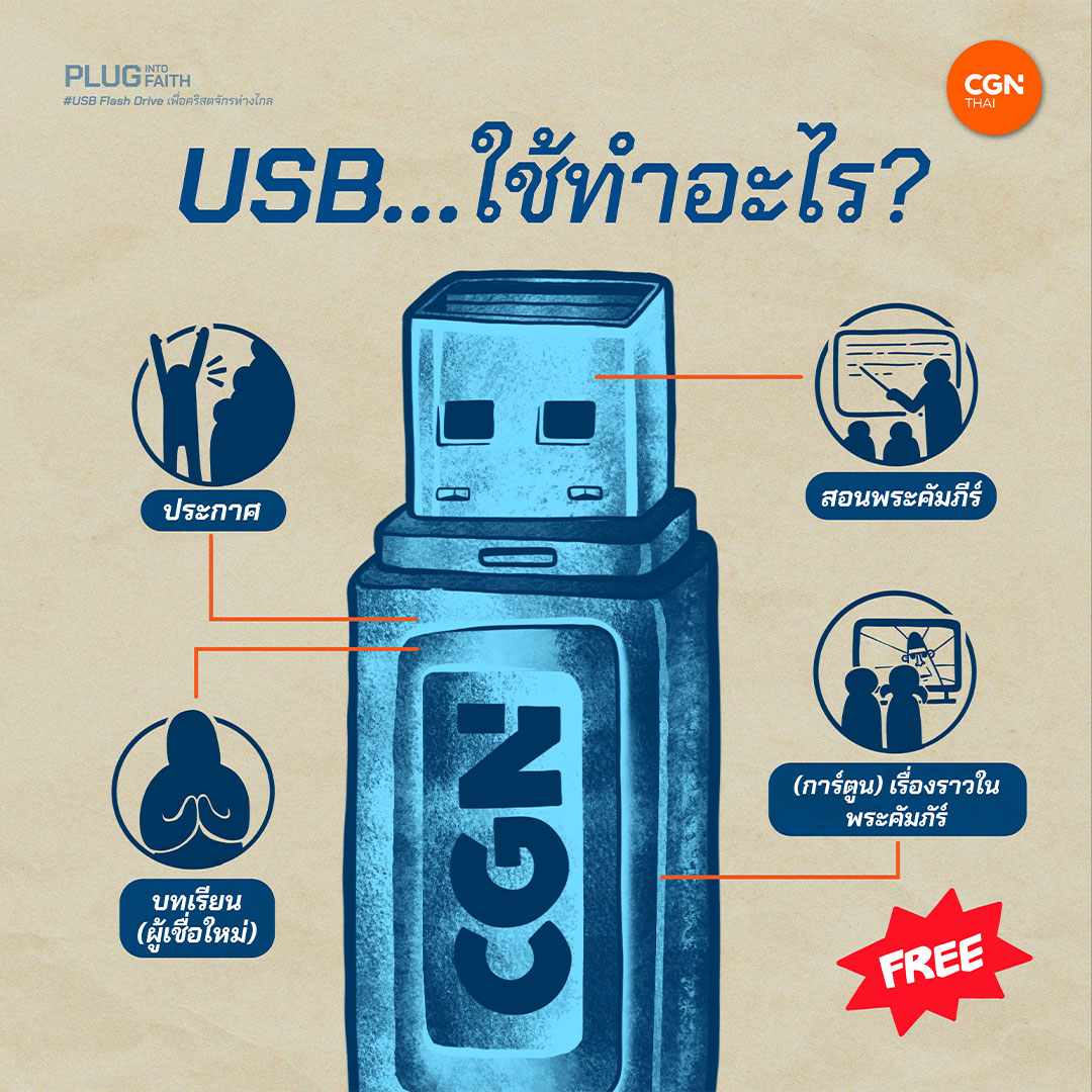 ยูเอสบีแฟลชไดร์ฟนี้ประกอบด้วยรายการของ CGN Thai มากกว่า 100 รายการ แบ่งตามหมวดหมู่ ได้แก่ รายการสำหรับการประกาศข่าวประเสริฐ บทเรียนผู้เชื่อใหม่ การสอนพระคัมภีร์ และรายการสำหรับสอนเด็กรวี โดยทั้งหมดสามารถใช้งานได้แบบออฟไลน์ เหมาะสำหรับคริสตจักรที่ไม่สามารถเข้าถึงสื่ออินเทอร์เน็ตได้อย่างมีประสิทธิภาพ