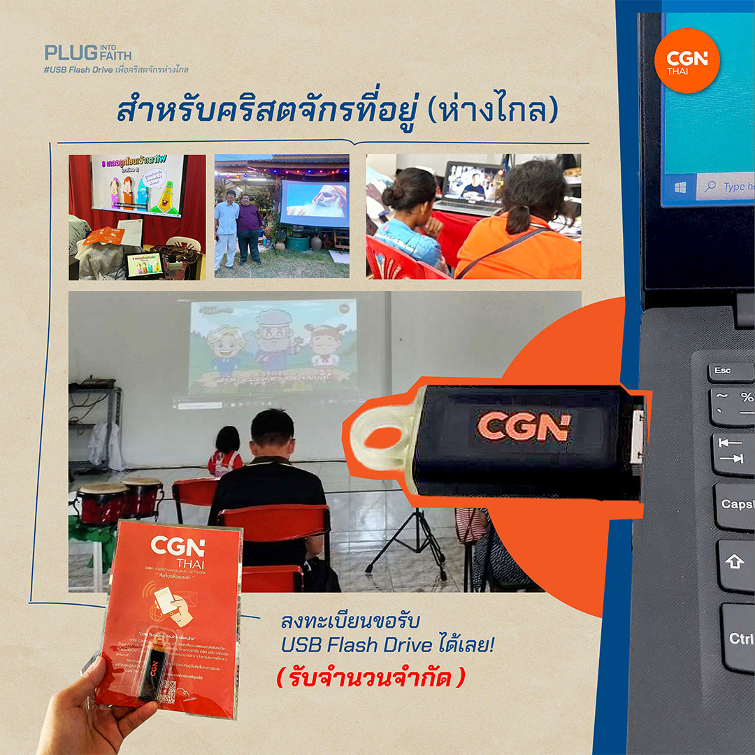 CGN Thai สื่อคริสเตียนที่ผลิตโดยคนไทย ออกบูธและพูดคุยกับผู้นำคริสตจักรในหลายจังหวัดทั่วประเทศ ได้รับฟังเสียงสะท้อนถึงความต้องการเครื่องมือสำหรับการสอนและประกาศข่าวประเสริฐในพื้นที่ห่างไกล จึงเกิดเป็นแคมเปญ “Plug Into Faith” ขึ้น เพื่อจัดส่งยูเอสบีแฟลชไดร์ฟซึ่งบรรจุรายการวีดีโอของ CGN Thai ให้กับคริสตจักรทั่วประเทศไทยโดยไม่มีค่าใช้จ่าย
