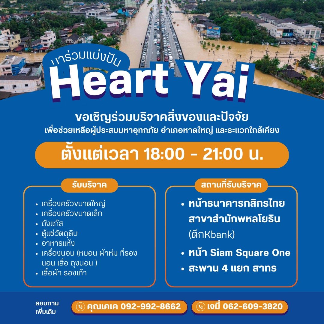 โครงการ Heart Yai เปิดรับบริจาคสิ่งของใน 3 พื้นที่ที่เดินทางสะดวก ได้แก่