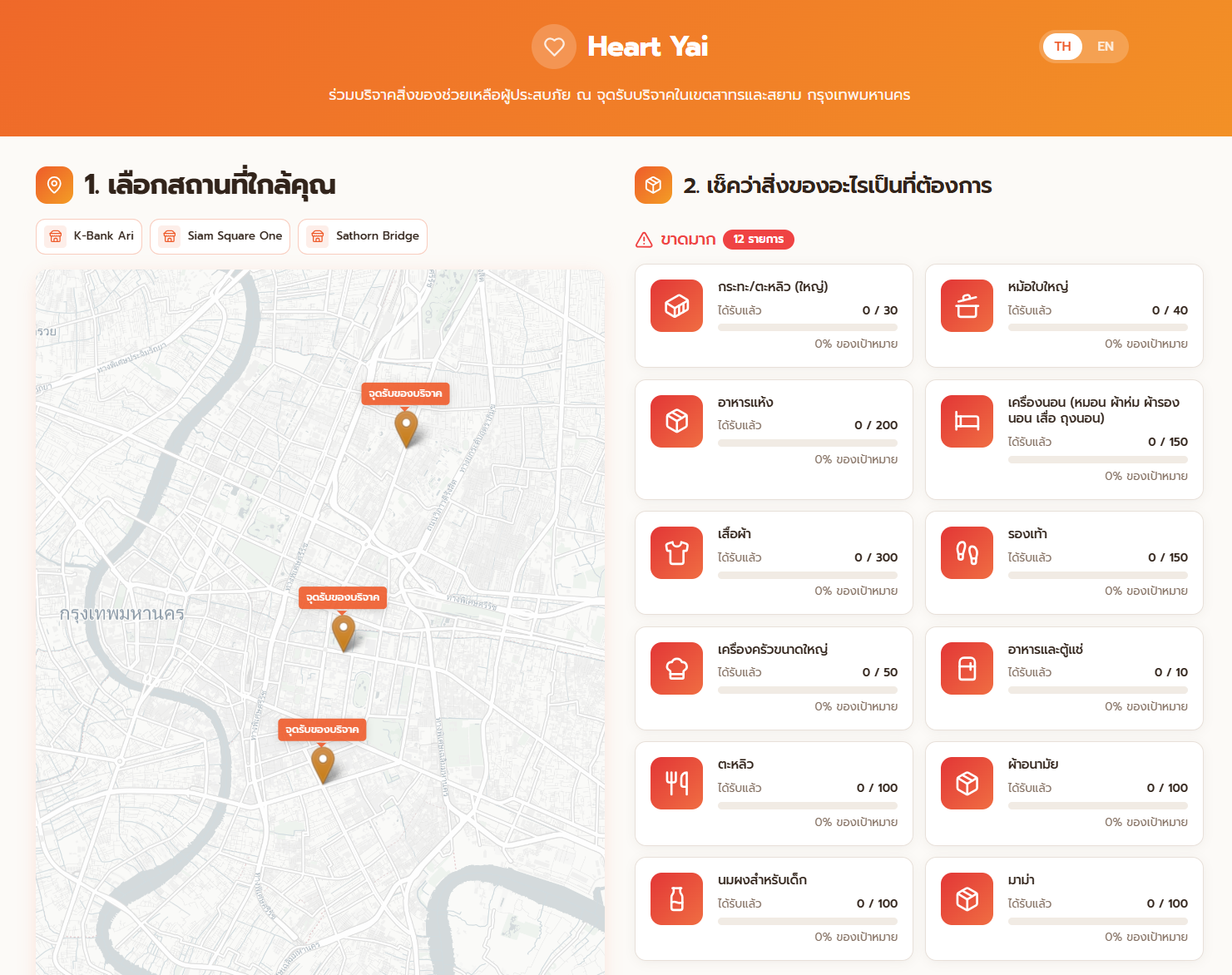 คุณเคเคอธิบายว่าเว็บไซต์ heart-yai.com ถูกสร้างขึ้นเพื่อเป็นระบบข้อมูลกลางในการบริหารจัดการ "Relief" (การบรรเทาทุกข์) และ "Recovery" (การฟื้นฟู) โดยเฉพาะ เพราะผู้ประสบภัยจำนวนมากต้องอพยพออกจากบ้านโดยไม่ได้ติดตัวอะไรมาเลย